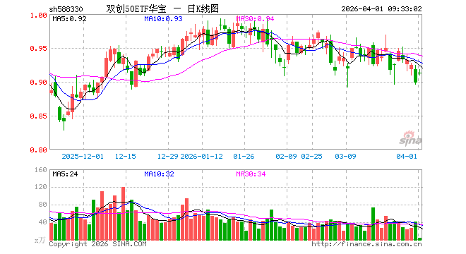4月1日,双创50ETF华宝(588330)开盘涨1.67%,报0.913元。双创50ETF华宝(588330)重仓股方面,中际旭创开盘涨3.79%,新易盛涨4.22%,宁德时代涨2.00%,寒武纪涨2.54%,阳光电源跌6.54%,中芯国际涨2.50%,海光信息涨3.25%,胜宏科技涨3.59%,汇川技术涨2.24%,澜起科技涨3.77%。